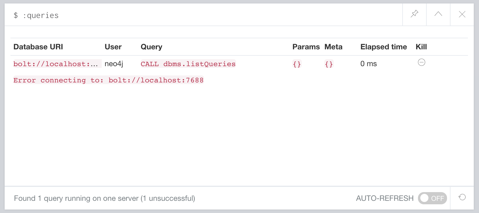 :queriescommand, the resulting frame displays the records returned from runningcall dbms.listQuerieson all cluster members. If theusernameandpasswordused on the current session are invalid with any of the other cluster members, the frame would throw an error and cause Neo4j Browser to become unresponsive.Fix: