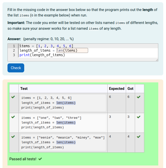 Accordingly, CodeRunner questions always use Moodle's adaptive behaviour, regardless of the behaviour set for the quiz in which the questions are being run. Students can check their code for correctness as soon as it has been entered and, if their answer is wrong, can resubmit, usually for a small penalty. The mark obtained in a programming-style quiz is thus determined primarily by how many of the problems the student can solve in the given time, and secondarily by how many submissions the student needs to make on each question.