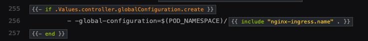When setting controller.globalConfiguration.create to true, the template creates a globalConfiguration custom resource with the contents of the controller.globalConfiguration.spec. The globalConfiguration resource it creates is named using the nginx-ingress.fullname value: