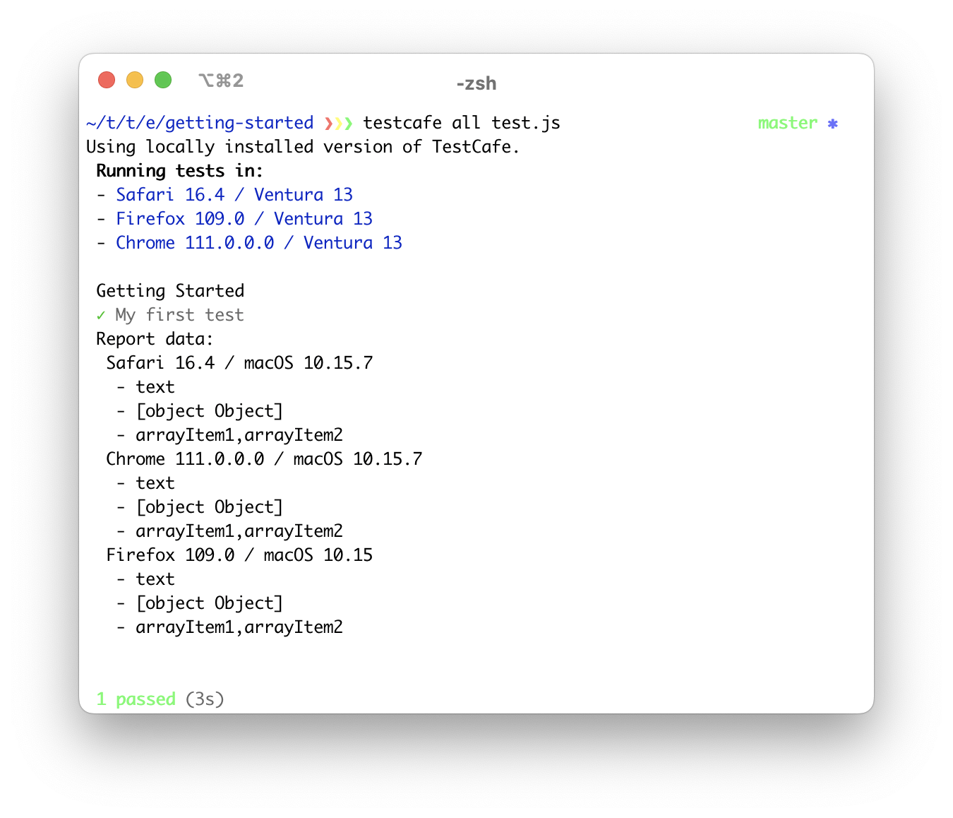 t.reportmethod passes custom data to the test reporter.--native-automationflag enables TestCafe to automate all Chromium-based browsers with the native CDP protocol.--esmflag allows users to import ESM modules in test files.t.report