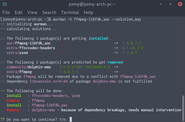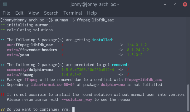 Now, aurman (optimistically!) assumes the dependency will be fulfilled.