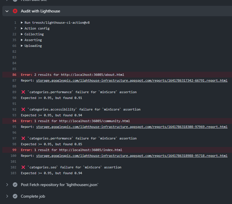 on our built site, and uploading the report as an artifact in GitHub Actions. The problem with this is that artifacts are relatively cumbersome to inspect. You have to go to the actions tab, scroll to artifacts, download them as a ZIP file, unzip them, and then inspect them.
