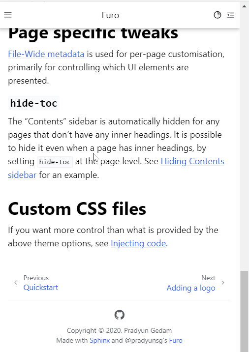One common pattern is to have a little "pop up" that occurs when people scroll upwards on mobile. For example, here's a pop-up for Furo: