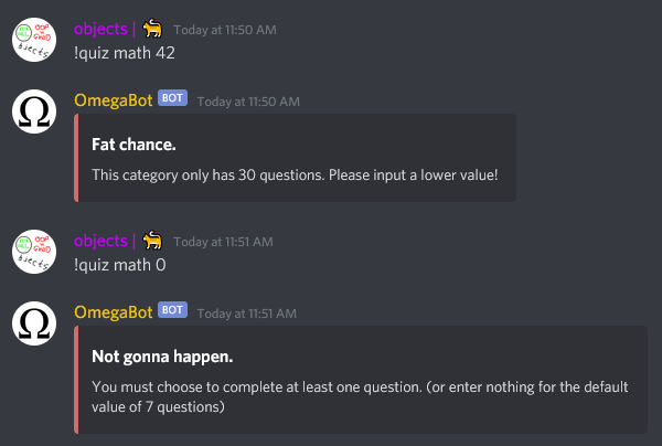 . Also changed the default from 5 questions to 8 questions. Added error embeds which will be sent when questions is larger than the amount of questions in that category, or if it's less than0