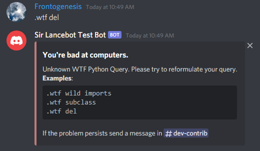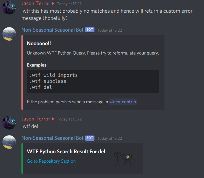 against the WTF Python's repository headers as defined in the README.md for the repository. If a match is found, the command will send an embed containing a link to the WTF Python's repository header.If no match is found above the minimum certainty threshold, an error message is sent in an embed that states the user's