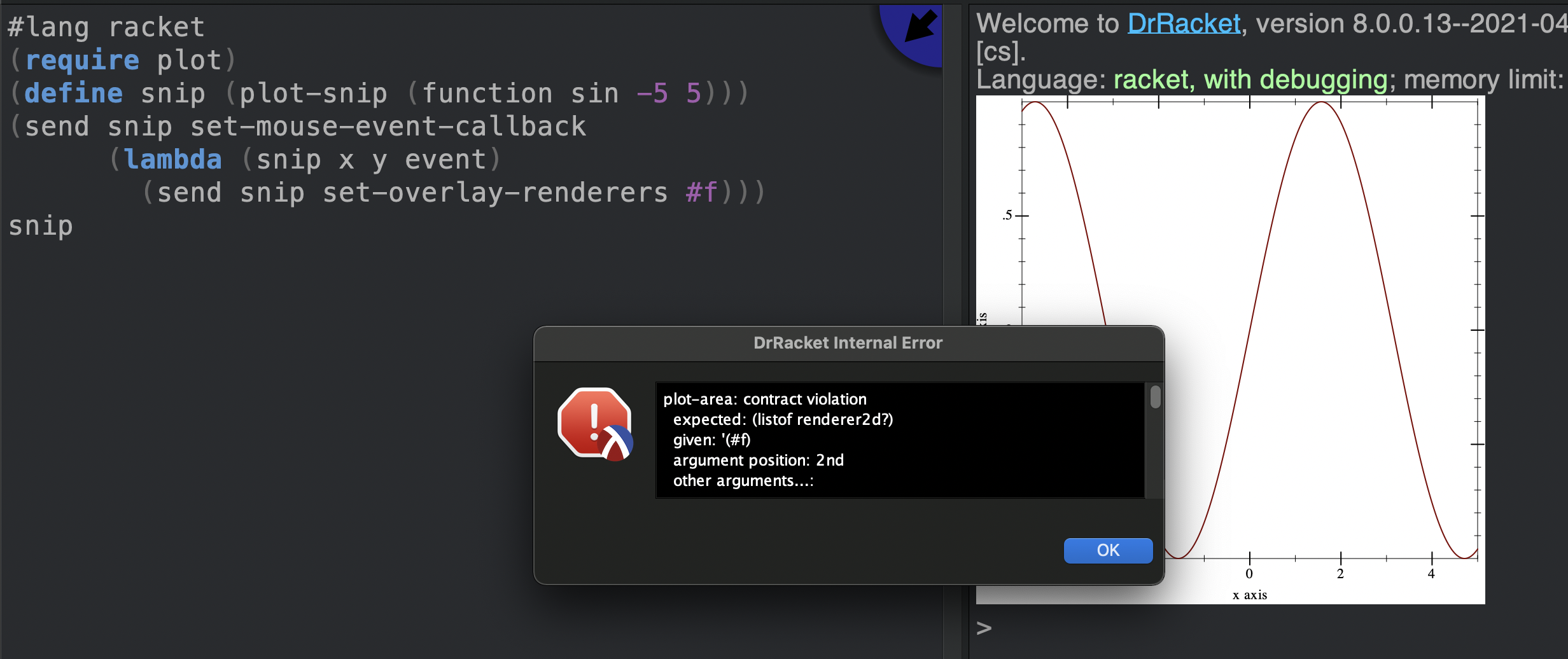 Hi @samth , this unfortunately does not fix the issue. Here is a simple program to reproduce the issue. You need to run it in DrRacket and move the mouse over the plot. Note that this will crash DrRacket. #lang racket
