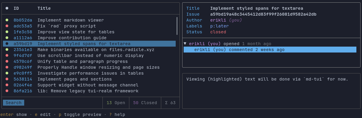 rad-tui <patch | issue | inbox>