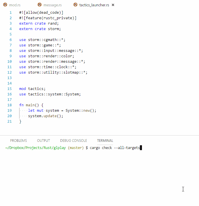 will produce no output until a file is modified. The GIF shows this happening in the integrated terminal, but this also happens when running in a stand-alone terminal. Cargo will produce no errors when it fails to produce debug information.
