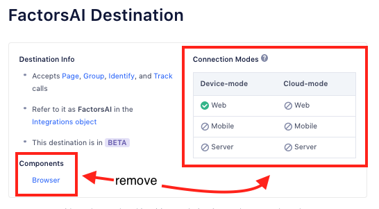 FactorsAI is cloud mode across all sources, there is no device mode integration. The root issue here is that the database entry for FactorsAI has a generic value set for browser_component that should be null but is not.