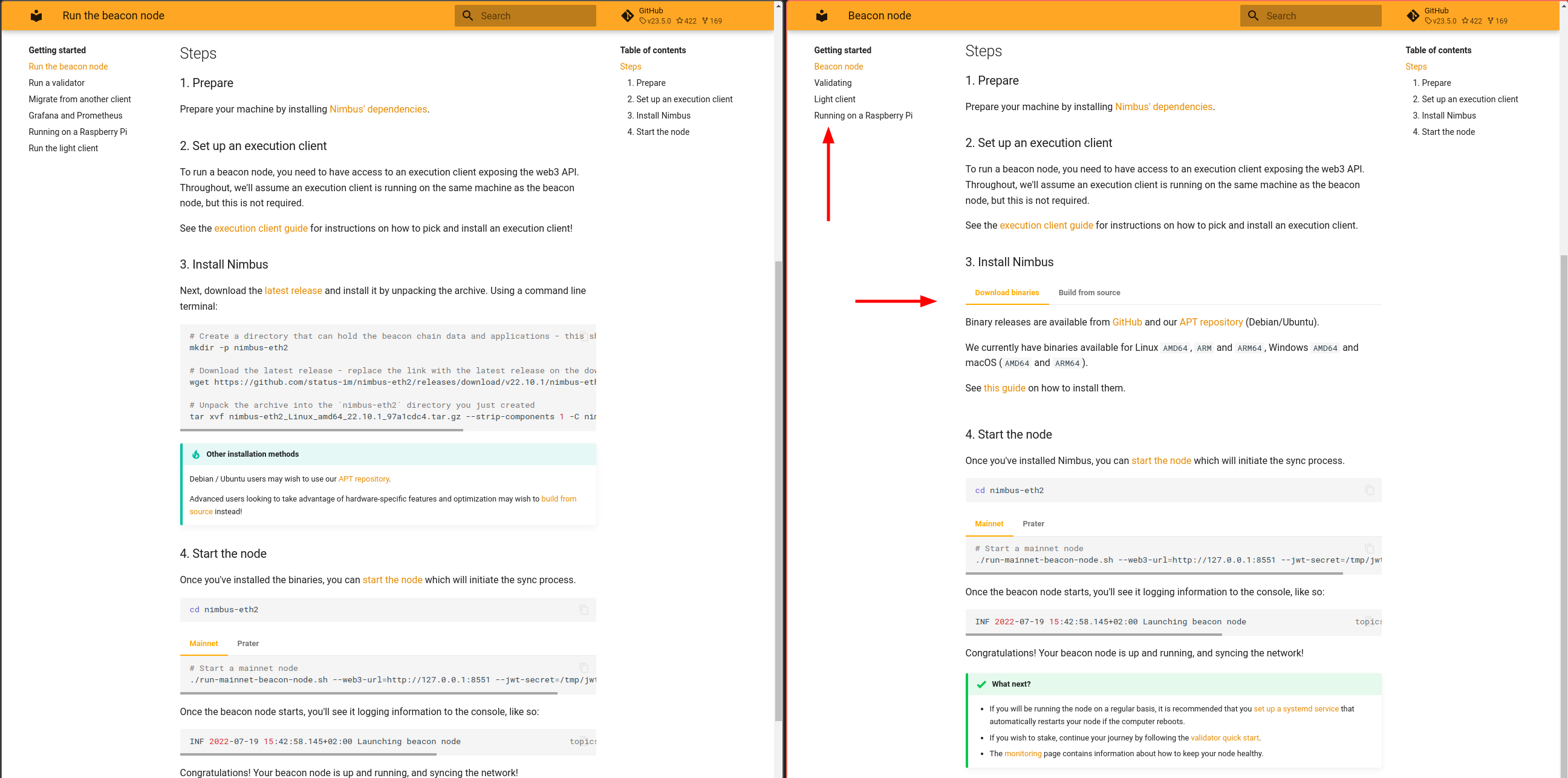 philosophy.mdis removed and its contents are part of the index page. This way the design goals (and Nimbus strengths) are immediately seen, and (IMO even more importantly) now when you click on the 'next' on the landing page, you're directly taken to the getting started with beacon node guide.Build prerequisites are now part of the "Prepare your machine" (
