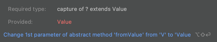 We still can use generics for main purpose to determine return type public interface ValueConverter<V extends Value, O> extends Converter {