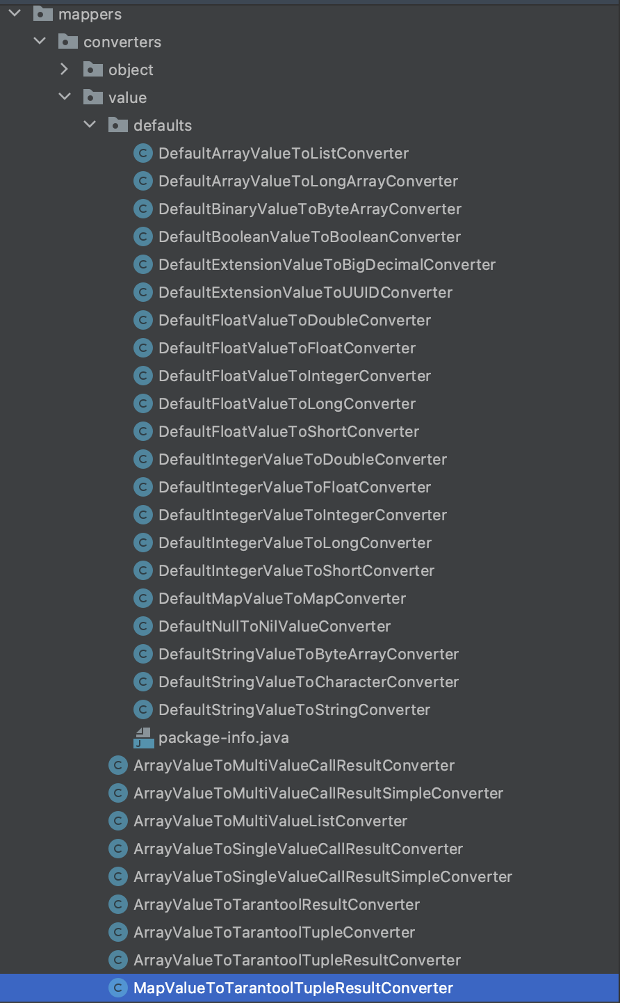 My logic was that we have TarantoolTupleResult stuff and we add on this stack SingleConverter. And we add some words, so we should have this SingleTarantoolTupleResult like we have a stack from the top to bottom, but from the lef to the right. I don't know why I added Tarantool to begin of name