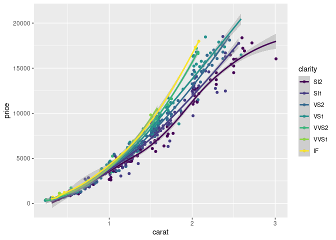 #> ! NA/NaN/Inf in foreign function call (arg 5)The issue is that the "I1" clarity group has just two observations, and therefore geom_smooth() can't fit anything. If I remove those data, now it works: