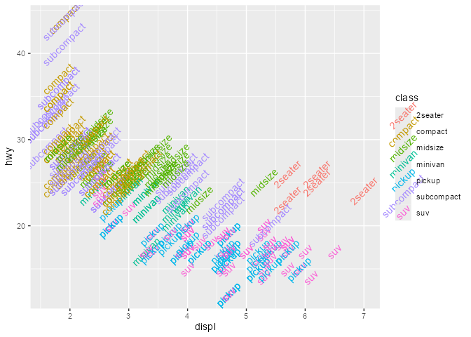ggplot(mpg, aes(displ, hwy, label = class, colour = class)) +
