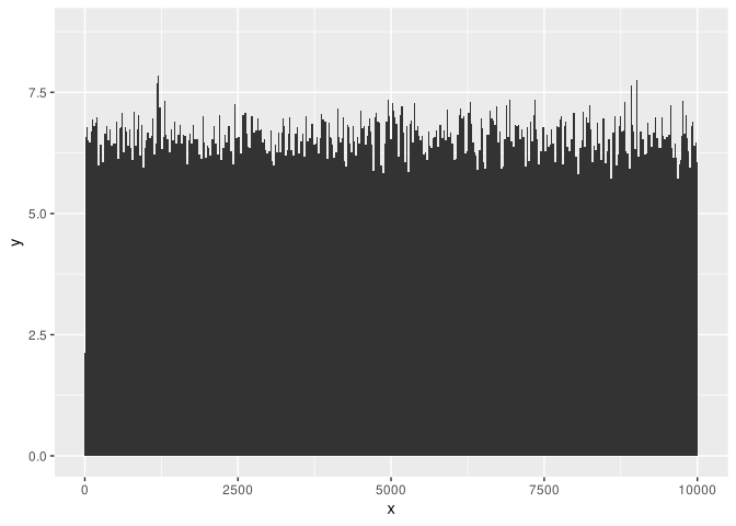 I was recently making some figures in which I wanted a simple geom_area() call on something with quite a few points. However, I noticed that my computer was waiting for a long time when calling the function. I had previously plotted something with geom_ribbon() instead, and it was almost instant there. After playing around, it seems that by default on my machine geom_area() is way slower than geom_ribbon() for some reason.