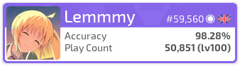 pp- Where you want the pp to be displayed. Undefined does not show at all,0shows in place of the level,1shows next to the accuracy and2shows above the rank.removeavmargin- If specified (no value required), there will not be a 3px margin between the card's stroke and the profile picture.flagshadow- Adds a shadow to the flagflagstroke- Adds a stroke to the flagcountryrank- Shows your country rank (experimental)darkheader- Darkens the text in the headerdarktriangles- Darkens the trianglesopaqueavatar- Adds a white background behind the avataravatarrounding- Sets a custom rounding for the avatar - must be a numeric valuerankedscore- Whether to show the ranked score in place of the Play Count or not