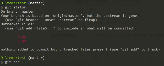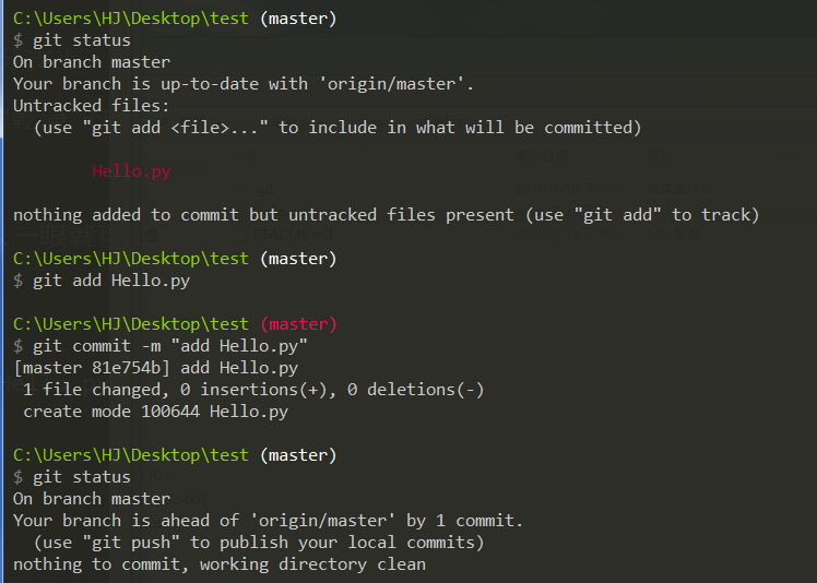 然後使用 git status 觀看目前的 repository ( repo 容器 ),你會看到 Hello.py 未被追蹤,如下圖