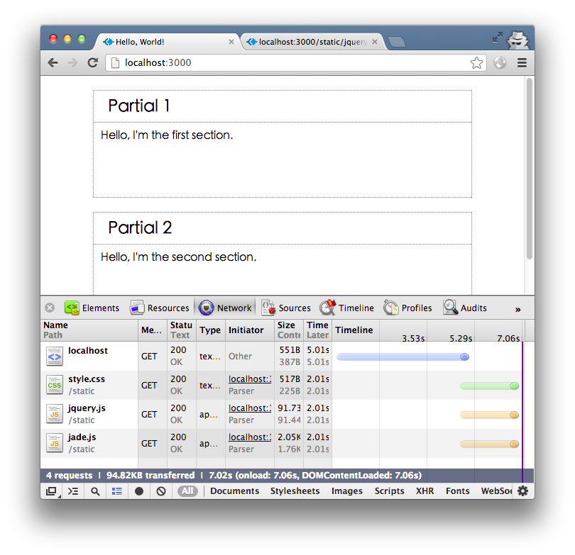 本文的代码在 https://github.com/undozen/bigpipe-on-node ,我把每一步做成一个 commit 了,希望你 clone 到本地实际运行并 hack 一下看看。因为后面几步涉及到加载顺序了,确实要自己打开浏览器才能体验到而无法从截图上看到(其实应该可以用 gif 动画实现,但是我懒得做了)。