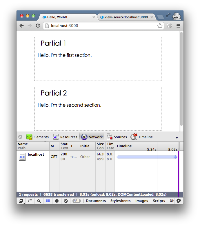 s2 的处理与此类似。这时你会看到,请求网页的第二秒,出现两个空白虚线框,第五秒,出现 Partial 2 部分,第八秒,出现 Partial 1 部分,网页请求完成。