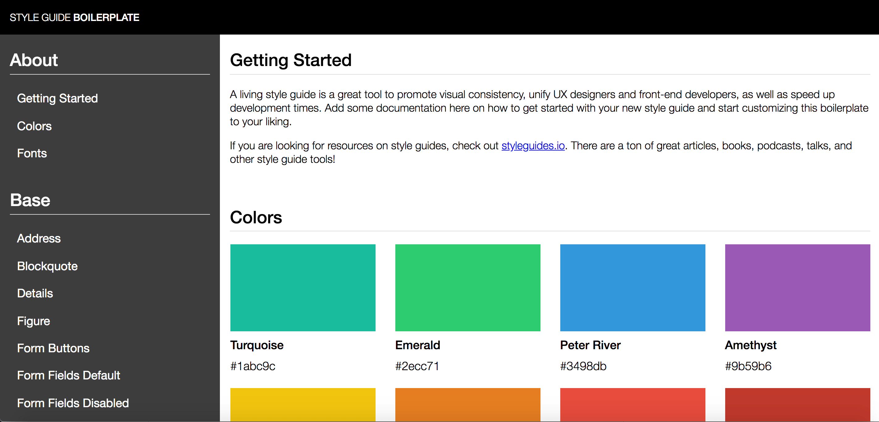 In the <head> of Style Guide Boilerplate are custom styles for the boilerplate itself. These have all been prefixed with sg- so they hopefully shouldn't cause any conflicts with your website's own styles.