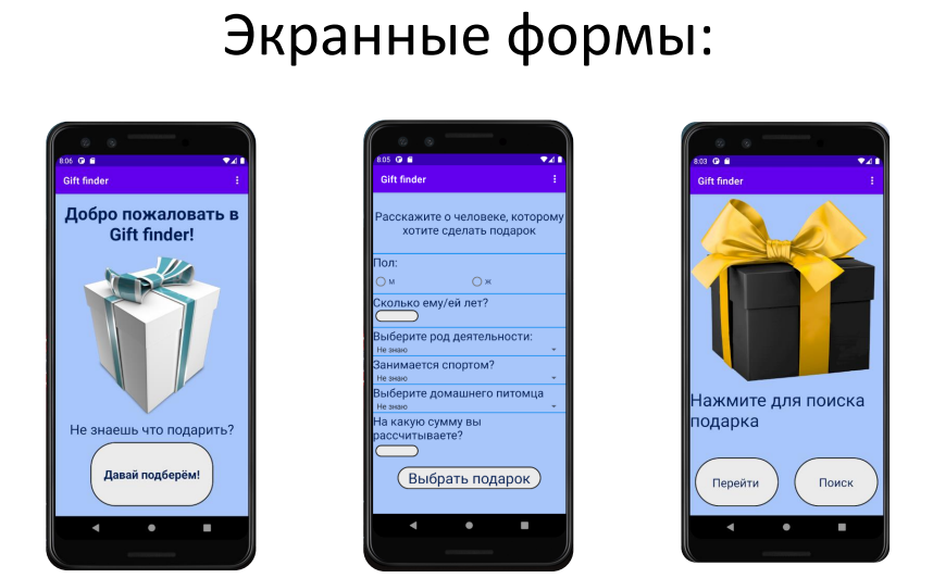 Мобильное приложение для поиска подарков, для запуска необходим сервер, написанный на php. https://drive.google.com/file/d/1QdGnXUroGIJJ6qmMTtSNgV7bBooWroUf/view?usp=sharing