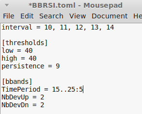 The above example will generate 15 backtests with unique configurations. Syntax for brute force is: start..end: step (as in the case of TimePeriod) or value1, value2, value3 (example from interval). The generated values for TimePeriod are 15, 20, 25. After saving the file, run the backtest of the given strategy, eg backtest.pl -s BBRSI.