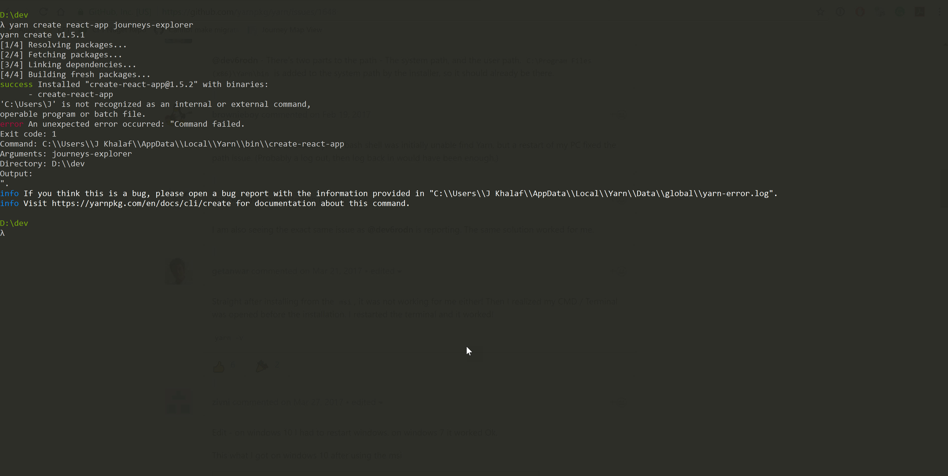 Hello I [read this](https://yarnpkg.com/lang/en/docs/cli/create/) and wanted to use the create command, so I ran: `yarn create react-app journeys-explorer` But I got the following error:  I was expecting to have my create-react-app generated. I am on Windows 10 Pro and my Yarn version is 1.5.1